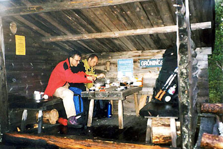 Oben auf der Hochebene schlugen wir unser Zelt neben dem Unterstand auf. Im Unterstand kochten wir dann ein leckeres Abendessen: Dosenschinken in Champignon-Whisky-Sauce mit Polar(Fladen)brot (Alles, bis auf den Whisky, in Särna eingekauft. Der Whisky gehört natürlich zur Standard-Verpflegung ;-) ).